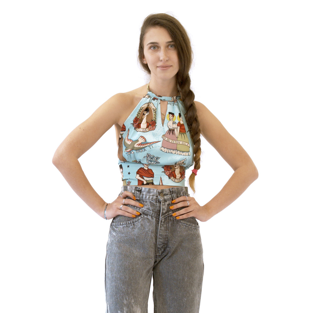טופ קולר בד כותנה הדפס של פרידה קואלו בצבע תכלת.
